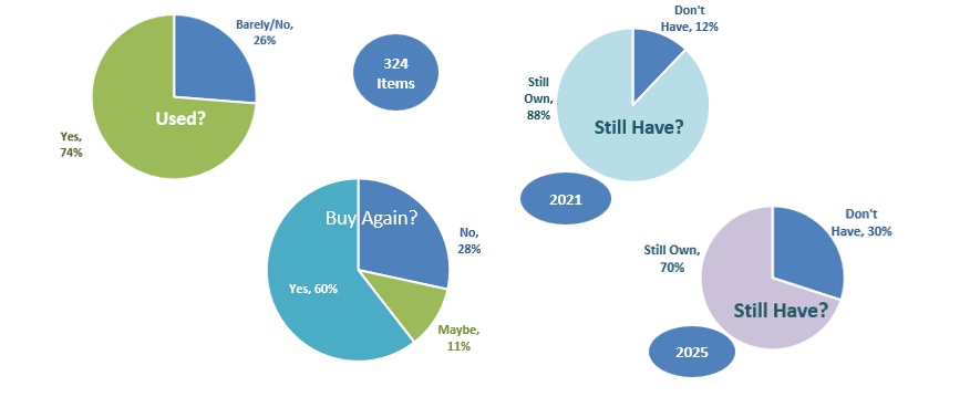 So, how’d I do? Of the 324 items, 240 were left once I took out food, consumables (such as soap, beauty products, and dental floss), and gifts to others (as those were given away and so, obviously, I can’t track them years later). Of that, I still had most of it or 88% at the end of 2021 and 70% towards the end of 2025. So, I’m keeping most of what I buy.